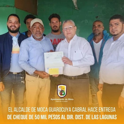 El alcalde Guarocuya Cabral de Moca, entregó al director del Distrito Municipal de Las Lagunas, Ing Humbert Germosén, un cheque de 50 mil pesos como aporte del ayuntamiento de Moca al club de baloncesto de Jábaba-El Aguacate para pago de mano de obra para la construcción de las Gradas en la cancha mixta de la comunidad. Observa el regidor Billy Almánzar y el Lic Alvyn García.